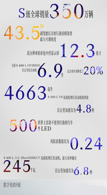 & ?0 P0 o, E6 x J/ R* k 解读全新梅赛德斯-奔驰S级轿车有很多种方式,最直观的莫过于用数字说话!就让我们,用最精准的方式,去体验全新S级轿车的巅峰极致与王者风范!